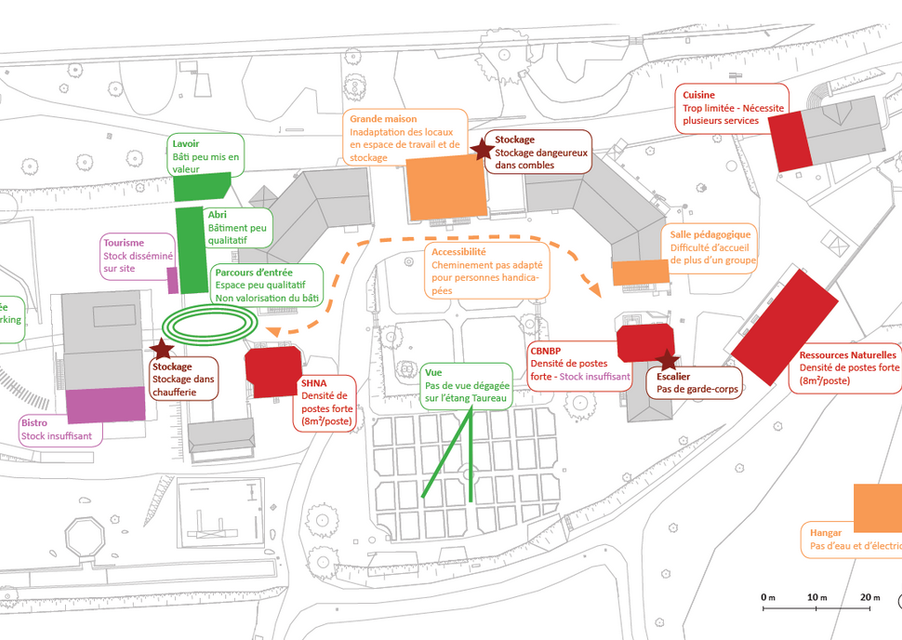 L’évolution des prérogatives, des partenariats et des missions du Parc a mené à un développement et une occupation de l’ensemble des espaces bâtis du site. Aujourd’hui, les besoins se font sentir, en particulier sur le manque d’espaces de travail, de stockage, d’espaces communs et d’espaces à destination des publics.